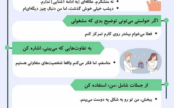 جملات «من» تمرکز را روی شما نگه میدارند، بنابراین آنها را سرزنش یا انتقاد نمیکنید. میتوانید بگویید «من الان دنبال قرار گذاشتن نیستم» یا «من در حال حاضر روی کارم تمرکز دارم و علاقهای به ادامه رابطه ندارم».
